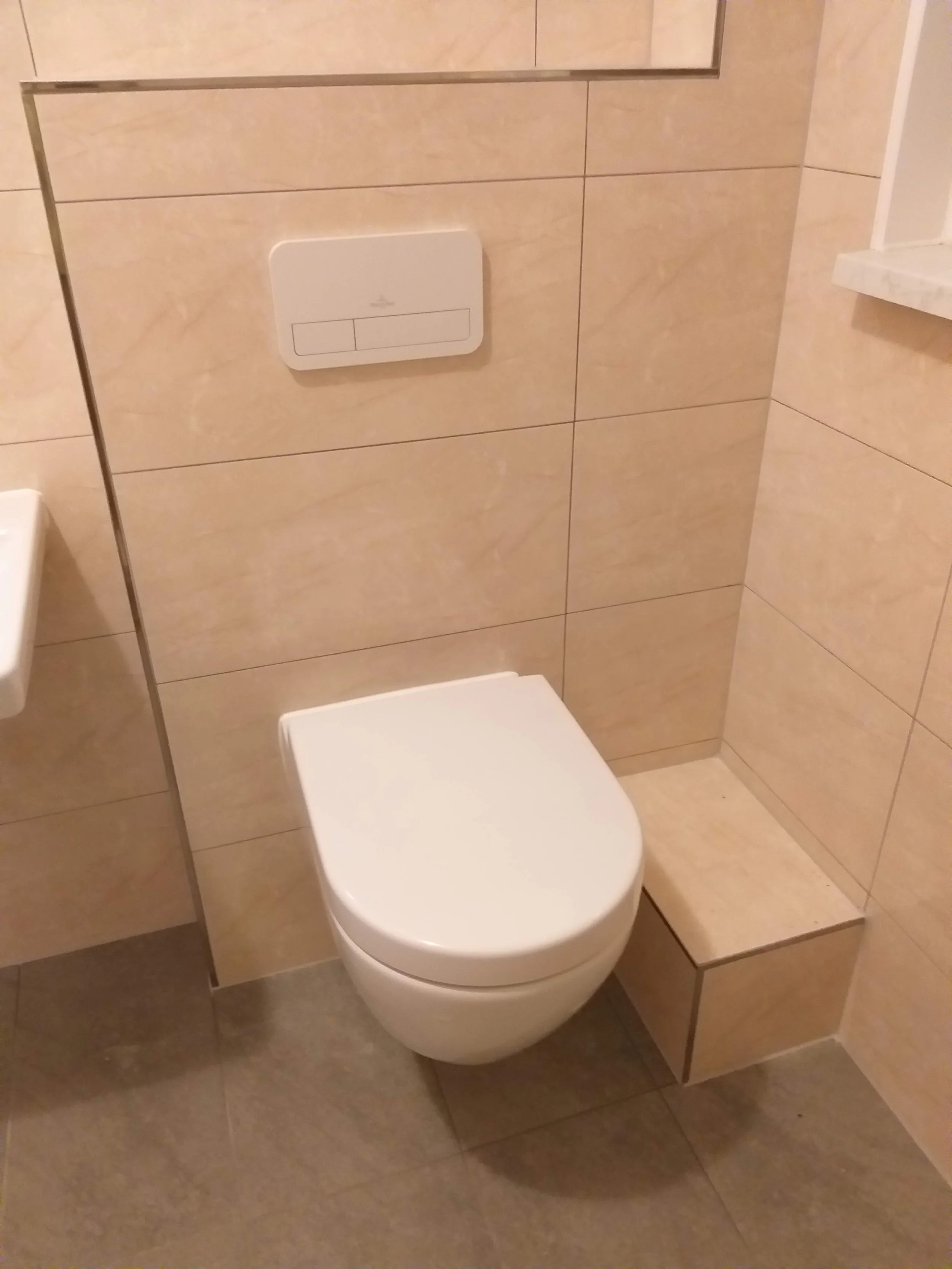 Wandmontiertes WC mit Spülkasten in Badezimmer, beige Fliesen