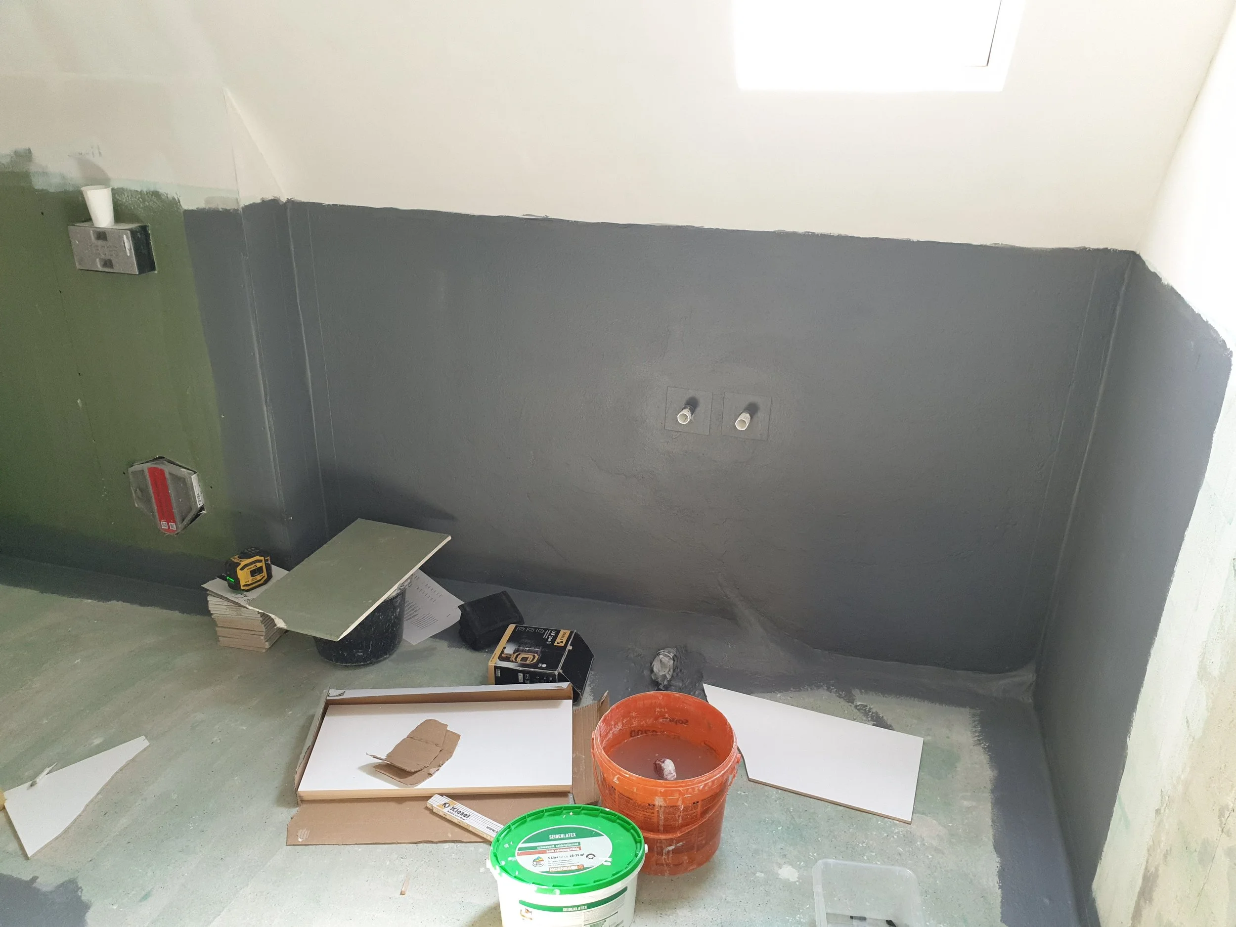 Unfertiger Bauabschnitt in einem Badezimmer mit grauem Anstrich, mehreren Rohmaterialien, darunter ein Eimer und ein Karton, sowie Werkzeug. Wasseranschlüsse sind an der Wand sichtbar.