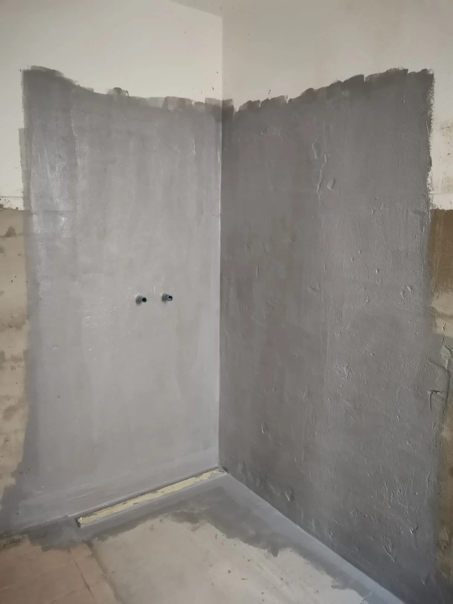 Graue Wände eines Raumes in Renovierungsphase, teilweise verputzt mit sichtbaren Spachtelarbeiten.