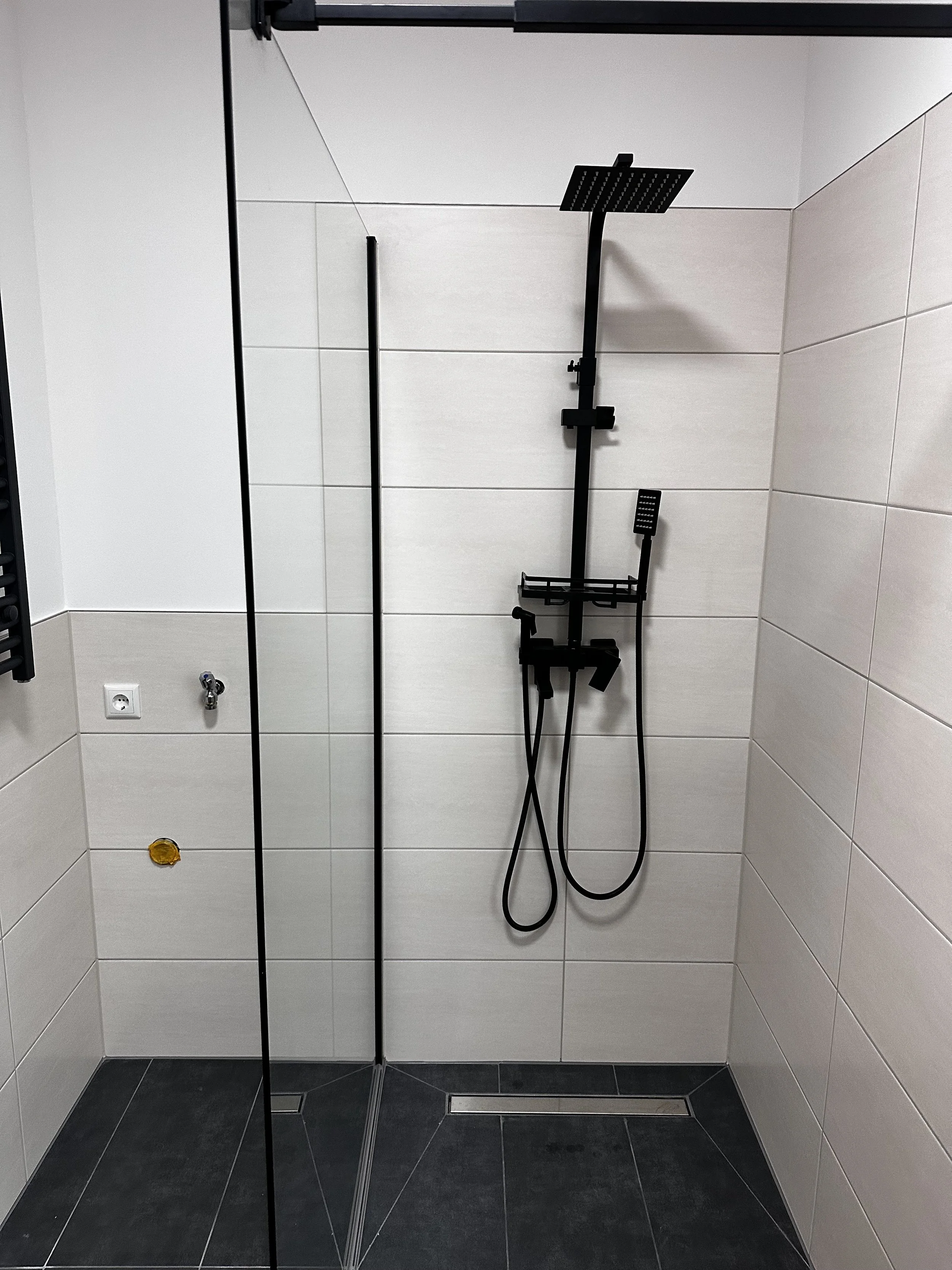 Moderne Duschkabine mit schwarzem Duschsystem und Duscharmatur, Glaswand, grauen Fliesen. Minimalistisches Badezimmerdesign.
