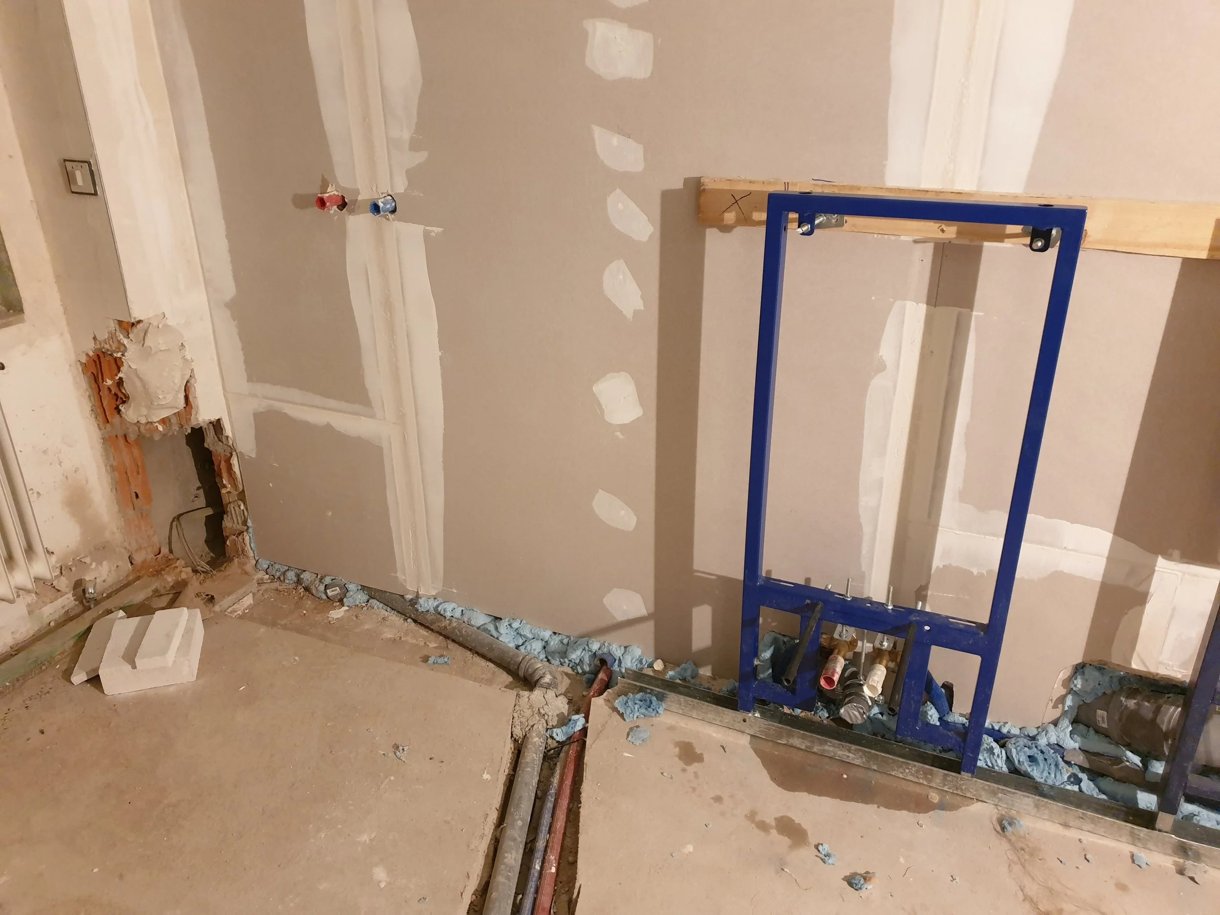Raum mit teilweise montierter Trockenbauwand und sichtbaren Sanitärinstallationen, inklusive blauer Rahmenkonstruktion. Boden mit Beton und sichtbarer Dämmung.