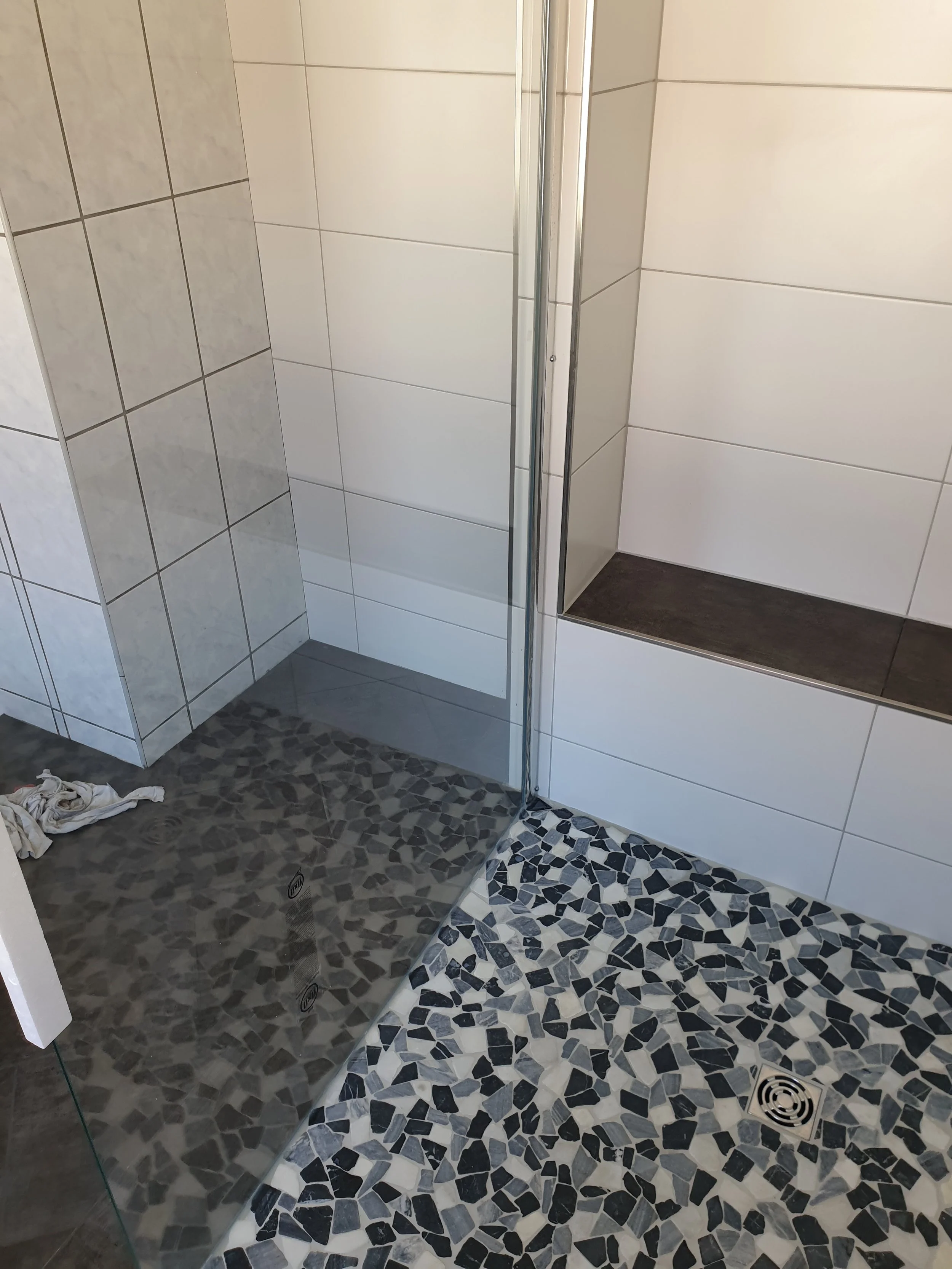 Moderne Dusche mit Glastrennwand, grauen und weißen Fliesen, schwarzem und weißem Mosaikboden, Sitzbereich, Abflussgitter und Handtuch auf dem Boden.