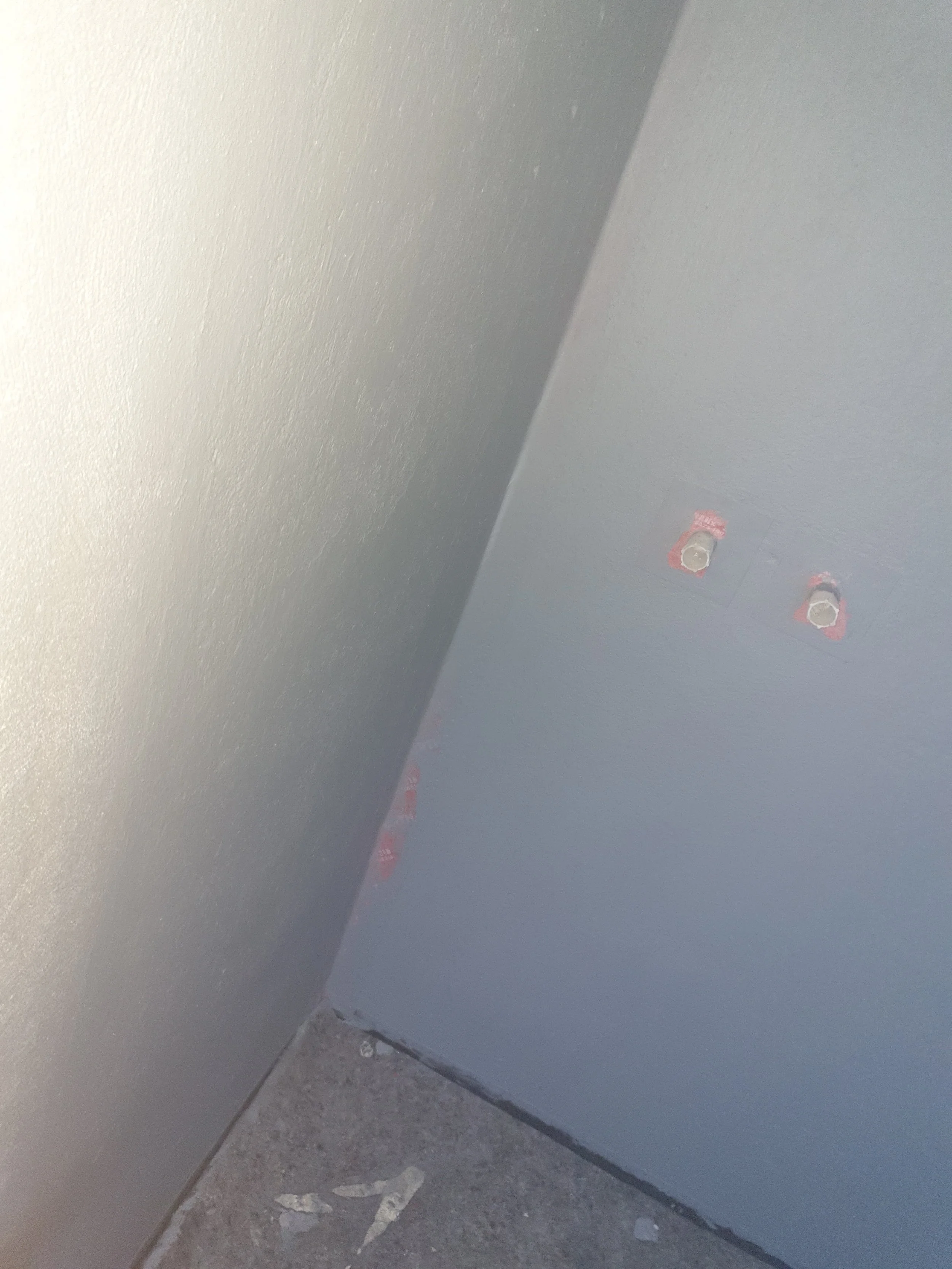 Eine Ecke mit zwei Wänden, grau gestrichen, und einem Boden mit sichtbaren Farbresten. An der rechten Wand sind zwei markierte Stellen erkennbar.