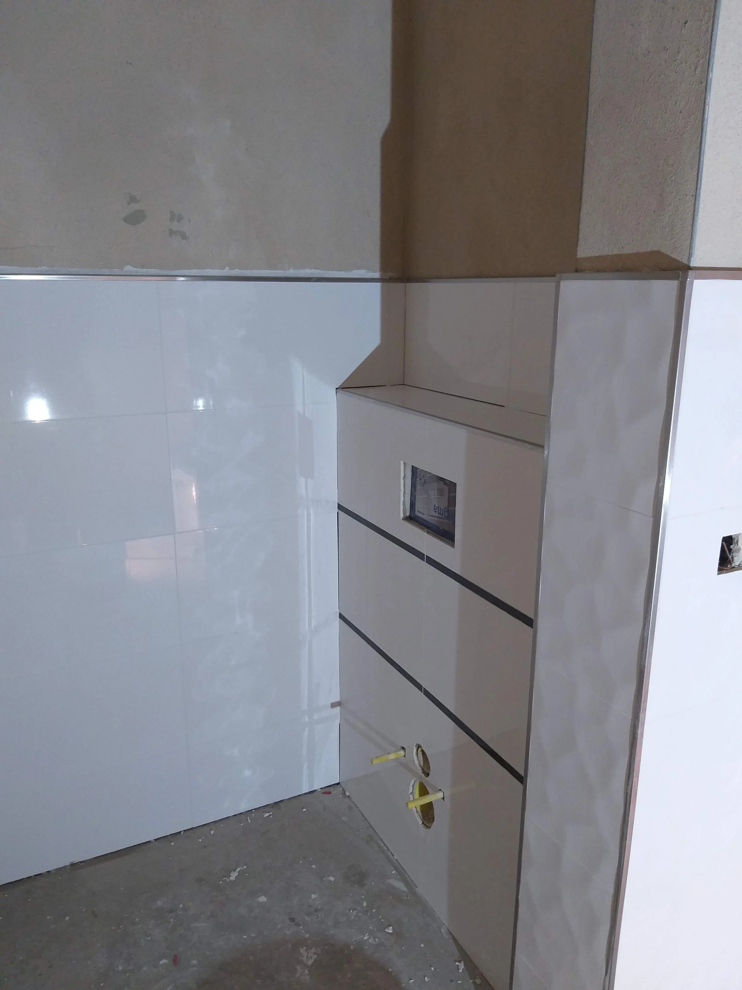 Unvollendeter Badezimmerbereich mit weißen Wandfliesen und sichtbaren Wasserrohren aus der Wand.