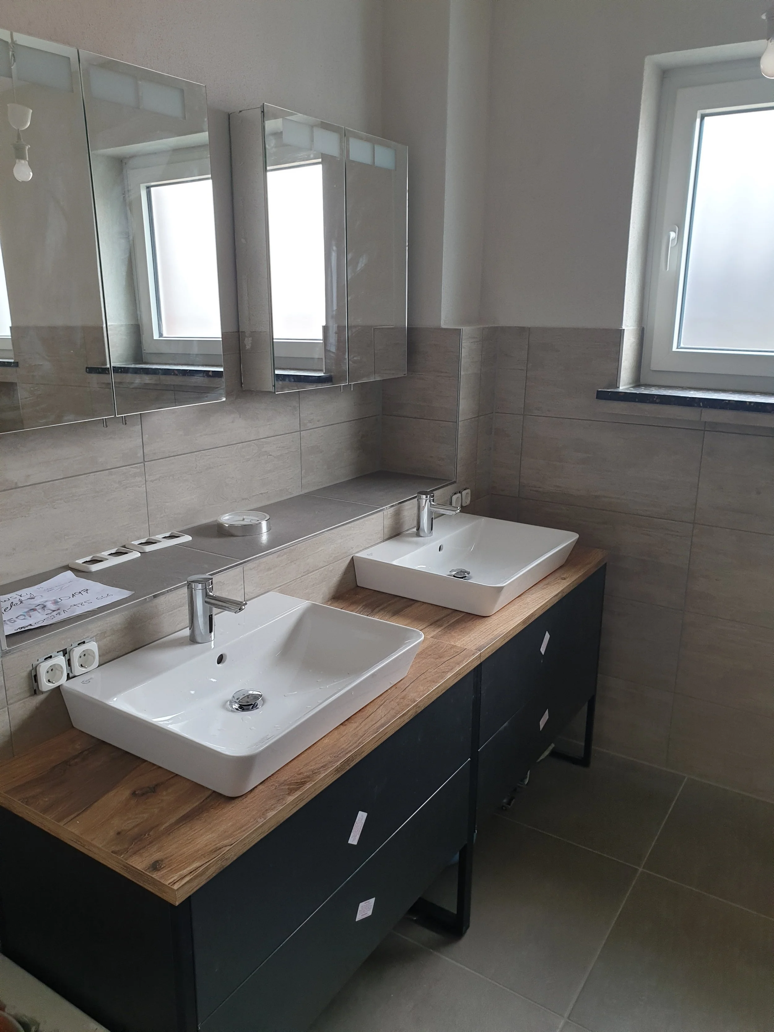 Modernes Badezimmer mit zwei weißen Waschbecken, einem Holzwaschtisch, zwei Spiegeln und einem Fenster.