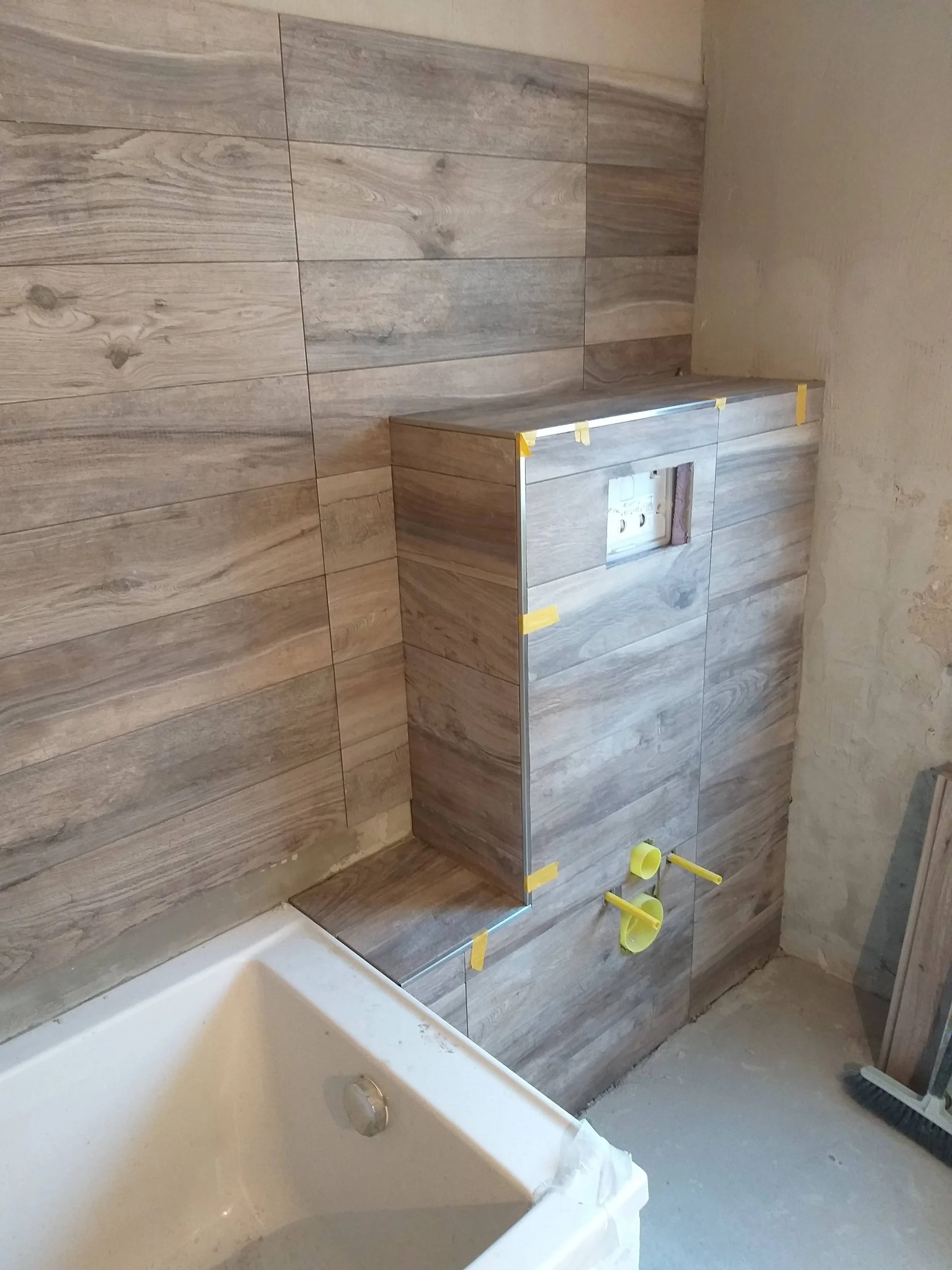 Teilweise gefliestes Badezimmer mit grauen Fliesen, unvollendete Wandinstallationen und einer leeren Steckdose.